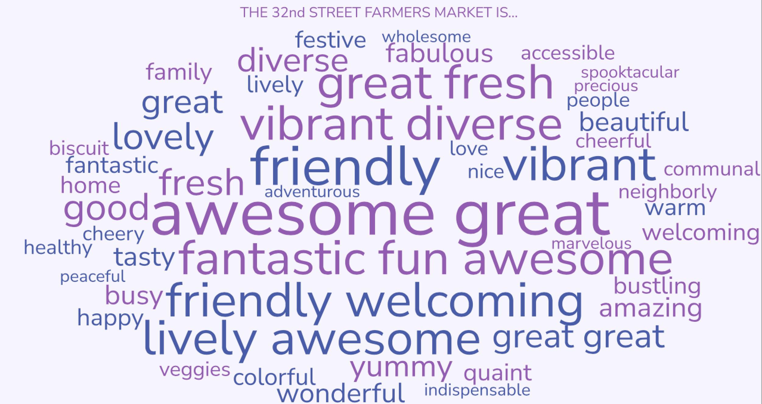 In October, we asked, “What word best describes the Market for you?” Here are the responses from 300 participants at the Giant Pumpkin contest. Three new social media programs set in motion greater support for vendors and outreach to the community. The new, very user-friendly website has seen nearly 6,000 visitors since its launch in October. The open rate of Seasonal Share, the new quarterly newsletter, was 72% (substantially over the benchmark of 35%). Migration to a new Instagram account brought noticeable increases in readership and involvement.